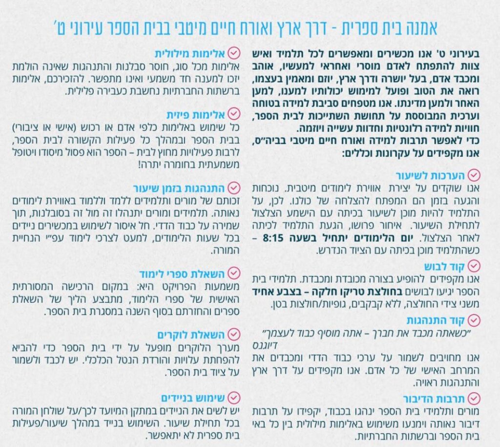 בבית הספר אנו מחויבים לשמור על ערכי כבוד הדדי ומכבדים את המרחב האישי של כל אדם.